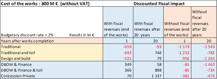 The following example deals with a 80 km motorway in France: construction cost 800 M€, traffic being 25 000 vehicles/day with 20% trucks and time saving amounting to 20 minutes compared to previous itinerary, and shows the results, with fiscal revenues and without. Depending on the decision to toll or not, and on accounting procedures, the budgetary NPV varies from a cost of 1 543 M€ to a benefit of 1 494 M€ after 20 years. It is necessary to use 3 different discount rates: the economic discount rate, used for economic, environmental and GDP calculations, the budgetary discount rate, used for discounting all budgetary flows, and the financing rate when there is an SPV (Special Purpose Vehicle) which has to borrow money for upfront financing of the PPP contract.